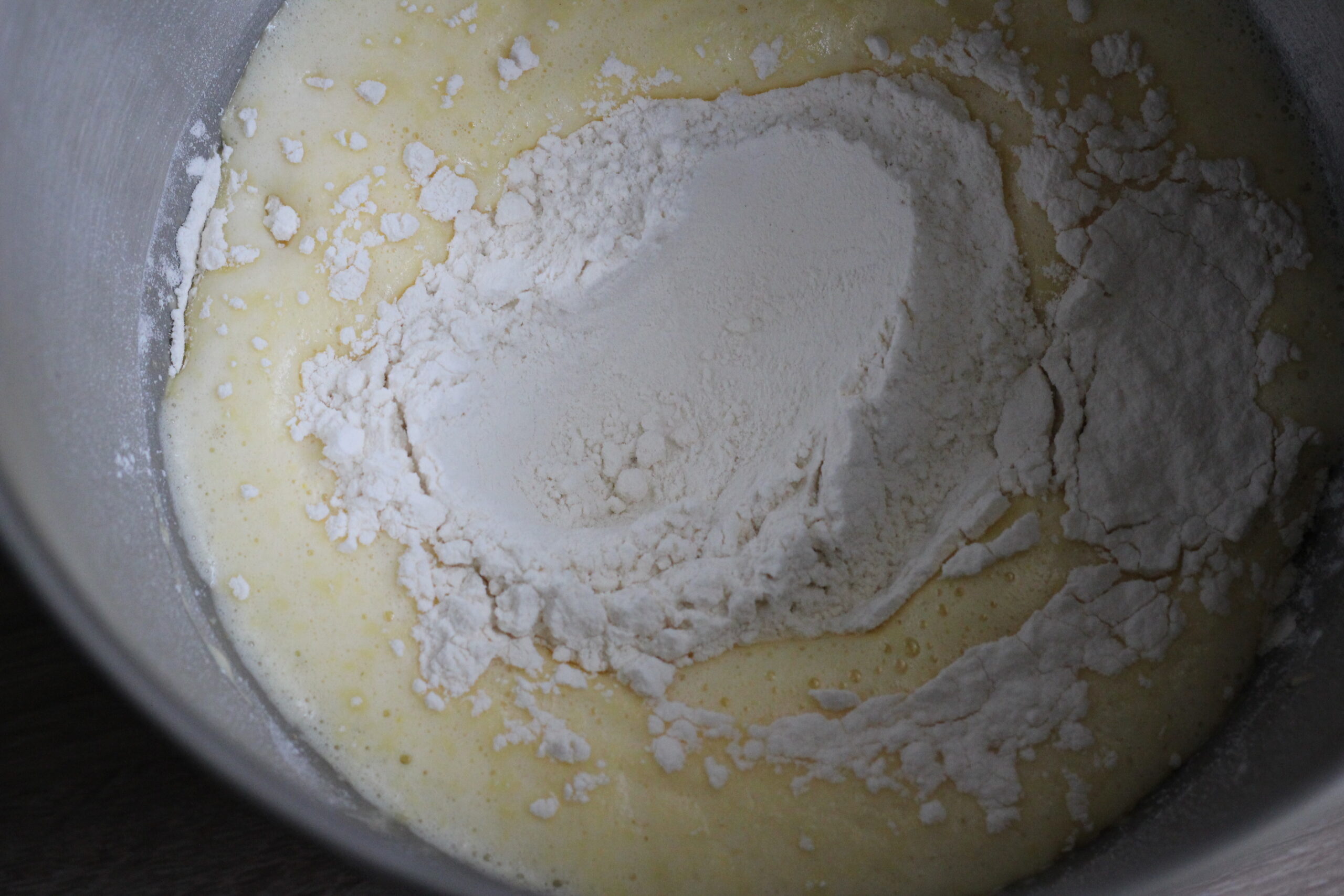 2. Добавить разрыхлитель, аккуратно просеять муку. Перемешать тесто лопаткой по кругу.