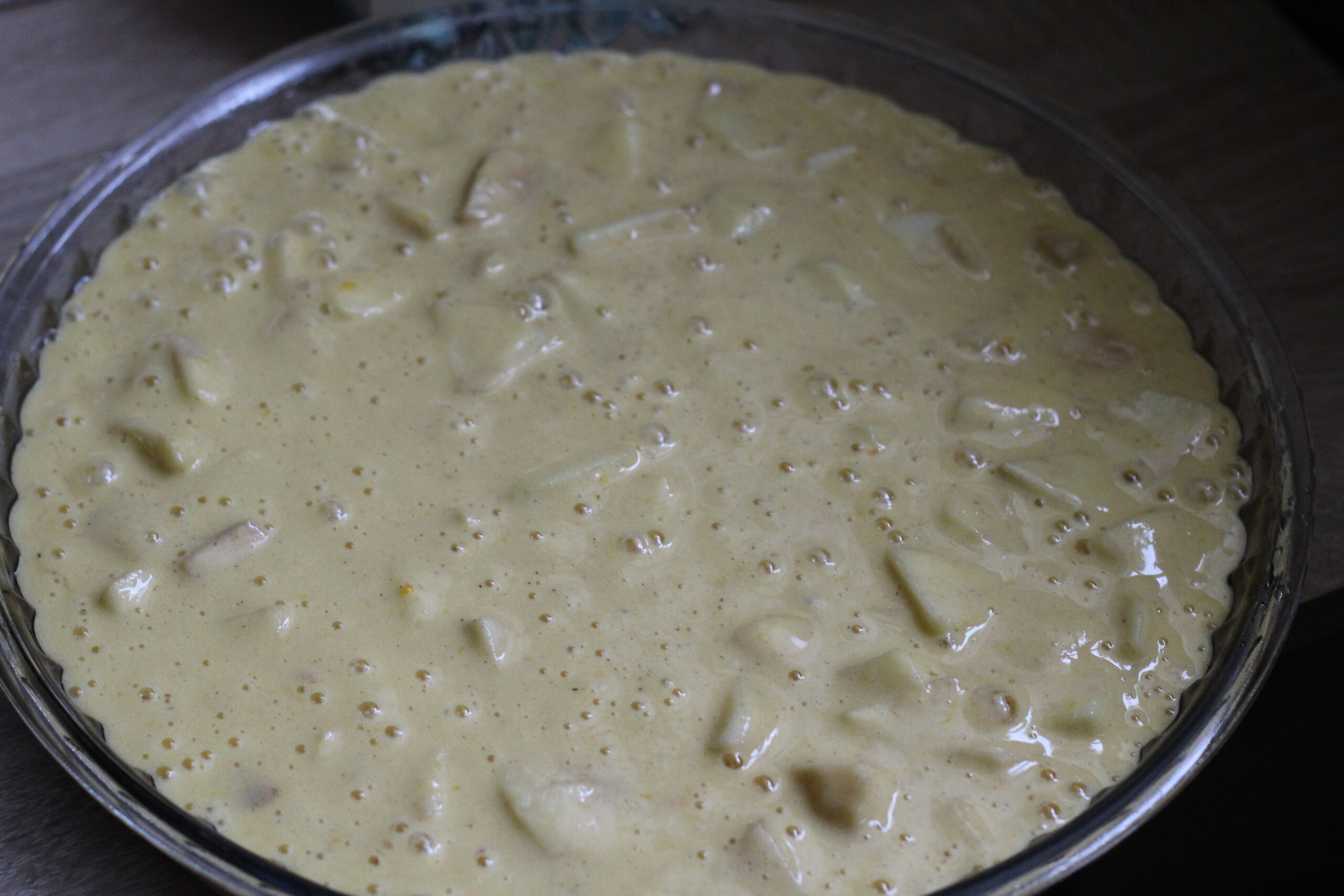 4. Выложить в жаропрочную форму яблоки, разровнять по дну. Залить кусочки фруктов тестом. Выпекать десерт до сухой шпажки при 170 градусах.