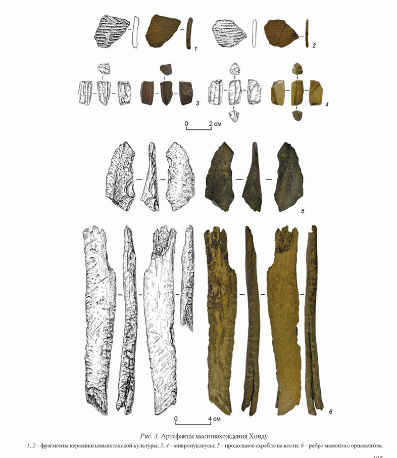 На данном этапе изучения местонахождение Хонду можно характеризовать как разновременной объект, включающий в себя плейстоценовый мамонтовый комплекс, а в археологическом плане находки пред ставлены палеолитическими, мезолитическими и неолитическими элементами. На данном этапе говорить о конкретном хронологическом возрасте объектов, обнаруженных в 2024 г., пока рано. Но полученные радиоуглеродные датировки (от 1,5 до 50 тыс. л.н.) из образцов зачистки и подъемного материала 2023 г., а также свидетельства поселенческой активности и артефакты, обнаруженные в текущем году, позволяют говорить о широком и активном освоении долины р. Хонду в разные периоды плейстоцена и голоцена. Характер первоначального расселения и последовательность развития человеческих палеопопуляций в условиях меняющихся экстремальных палеоэкологических условий Восточной Сибири в позднем плейстоцене и голоцене во многом делает феномен освоения данного региона первым почти глобальным примером адаптации человека к экстремальным условиям на территории Азии. Популяции, осваивав шие территории Якутии в условиях неоднократного изменения климата позднего плейстоцена и раннего голоцена сохраняли стабильную и единообразную технологию утилизации камня и кости, схожую в своих проявлениях.
