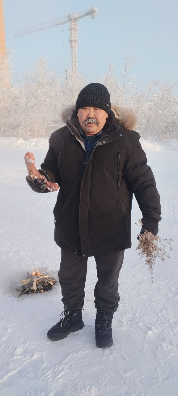 Виталий Егорович провел обряд жертвоприношения: чаутом завязал «рорат» — колбасу из внутренностей оленя, изображавшую жертвенного оленя, отрезал кусочки от него и бросил в сторону солнца, так же накормил духов земли и огня.