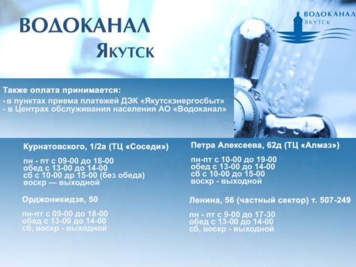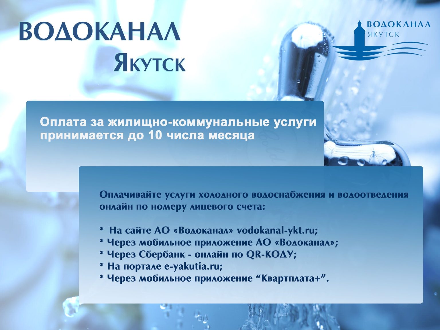 Оплата за услуги холодного водоснабжения и водоотведения принимается в пунктах платежей ДЭК «Якутскэнергосбыт», Центрах обслуживания населения АО «Водоканал».