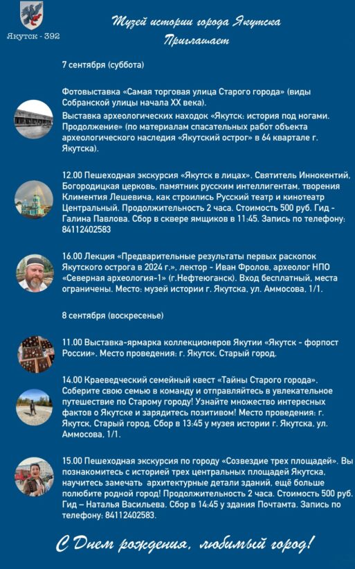 В эти выходные столица республики отметит 392 года со дня основания. Традиционно к празднику музей истории города Якутска подготовил программу, которая порадует приятным отдыхом, даст возможность открыть свой город поближе, молодым — узнать историю родного города, старшему поколению — предаться светлым воспоминаниям о детстве и юности.