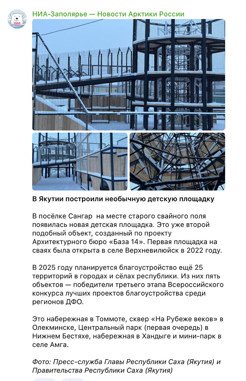 Пишу вам из Сангар. В январе Управление архитектуры и градостроительства (Папок Любовь) отчиталось, что у нас в поселке построили необычную детскую площадку, даже на сайте Национальныепроекты.рф об этом сообщили. Посмотрите, какое красивое фото опубликовали на всю страну, пишет Торбозное радио