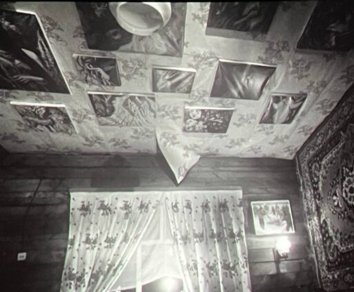 Картины на потолке как будто говорят «посмотри наверх», что можно интерпретировать как «помни о Боге и о своей душе». У меня возникла ассоциация с фресками под куполами соборов и церквей. А еще такое нестандартное место для вывешивания картин может предлагать зрителю смотреть фильм под другим углом или не в такой последовательности в какой он привык. И, действительно, зритель был немного сбит с толку из-за нелинейного повествования.