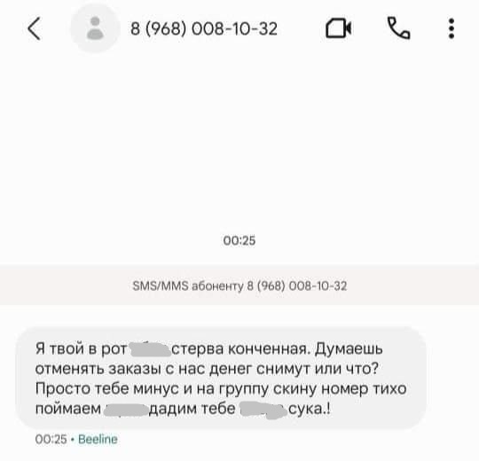 … не заказывала такси больше года и именно в этот день 08.11.2023 заказала такси в «Drivee» от сестры до дома. Из-за большого количества предложений водителей, случайно нажала не туда, и тут же отменила, водитель даже не начал двигаться на этот адрес. Как тут же мне прилетает смс сообщение после которого я боюсь теперь ездить на такси!!! Сообщение можете увидеть в публикации. После прочитанного у меня затряслись руки, и было недоумение как добраться до дома, так как не на шутку стало страшно за свою жизнь.
