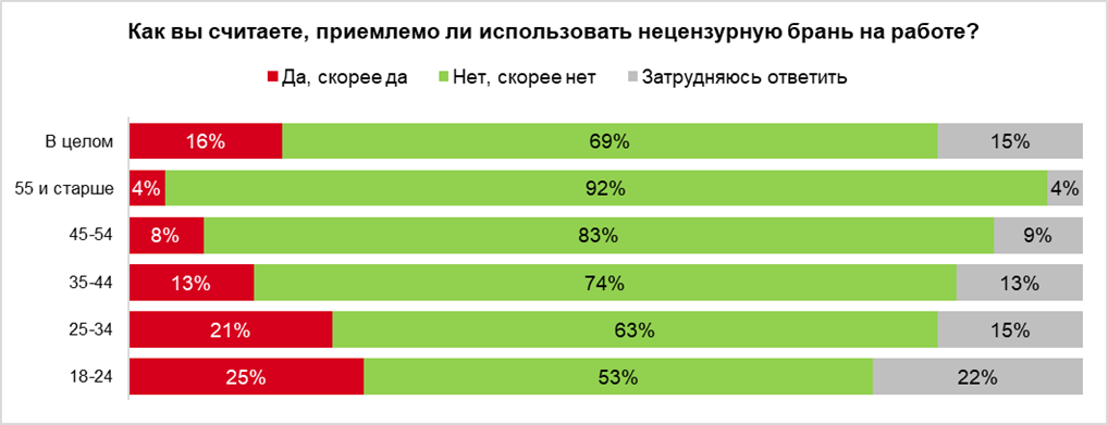 Интересно, что чаще всего нормой нецензурные слова называли респонденты в возрасте 18–24 лет (25%) и 25–34 лет (21%), реже всего — в возрасте 55 лет и старше (всего 4%). Кроме того, мужчины в два раза чаще женщин позитивно относятся к мату на работе — 22% против 10%.