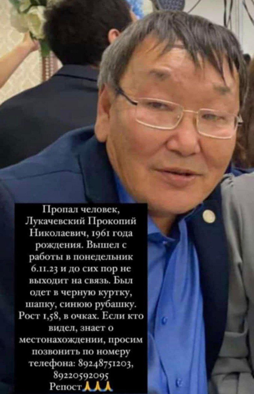 В Якутске пропал 62-летний мужчина Лукачевский Прокопий Николаевич. Вышел с работы в понедельник и не вернулся домой. Рост 1,58м, носит очки. Был одет в черную куртку, шапку и синюю рубашку.