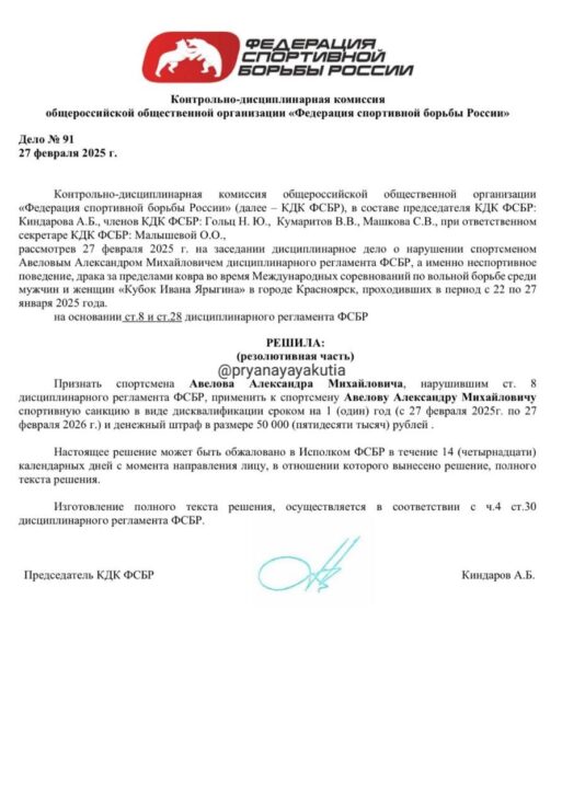 Но сейчас стало известно, что 27 февраля Федерация спортивной борьбы России дисквалифицировала Авелова на год со штрафом за неспортивное поведение, драку за пределами ковра. За что был дисквалифицирован якутский борец?