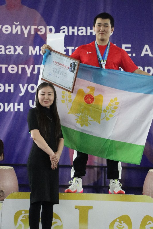 Финалисту абсолютного первенства в категории до 75 кг приз от семьи известного в прошлом хапсагаиста В.Д. Федотова вручила его дочь Ньургуйаана Васильевна Петрова, заведующая детсадом, ветеран педагогического труда.
