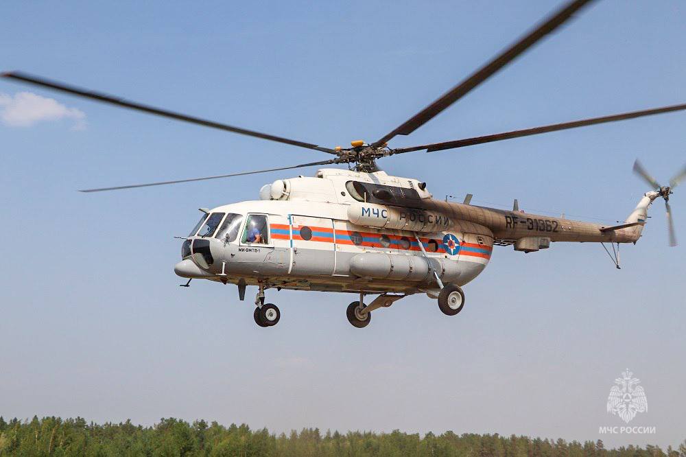 Для тушения природного пожара, а также снятия угрозы перехода огня на населенный пункт, в Томпонский район вылетел вертолет Ми-8 ХАСЦ МЧС России с водосливным устройством.