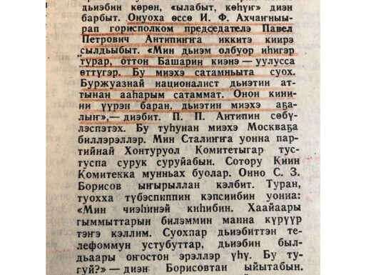 Только за февраль 1952 г. в газете «Кыым» вышло 79 материалов, разоблачающих буржуазных националистов, в газете «Социалистическая Якутия» – 48.