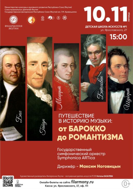 Государственный симфонический оркестр Symphonica ARTica под управлением Максима Ноговицына приглашает юных слушателей отправиться в музыкальное путешествие в историю музыки. Ведущая концерта Татьяна Кутугутова интересно расскажет об основных музыкальных эпохах, а оркестр исполнит фрагменты известных произведений Баха, Гайдна, Моцарта, Бетховена и Шуберта.