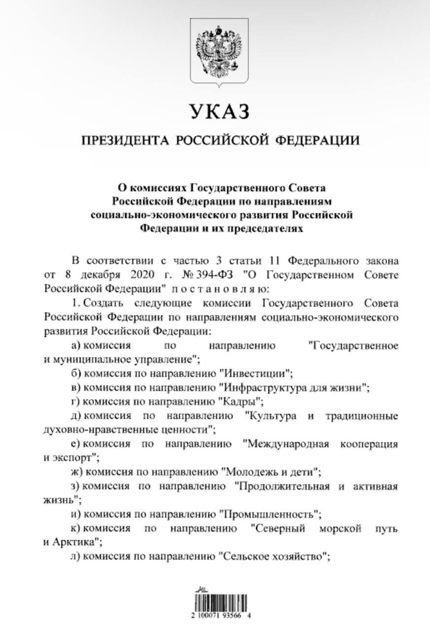 Президент РФ обновил структуру комиссий Госсовета по направлениям социально-экономического развития страны