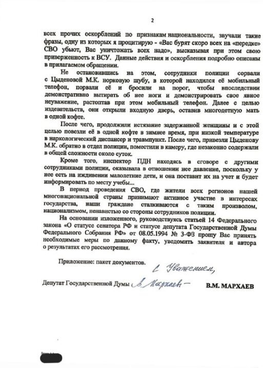 Депутат Госдумы Вячеслав Мархаев направил обращения в Администрацию президента, МВД, Следственный комитет и Прокуратуру в связи с незаконным удержанием полицией уроженки Бурятии в отделе полиции в г. Подольск, сообщается в телеграм-канале депутата.