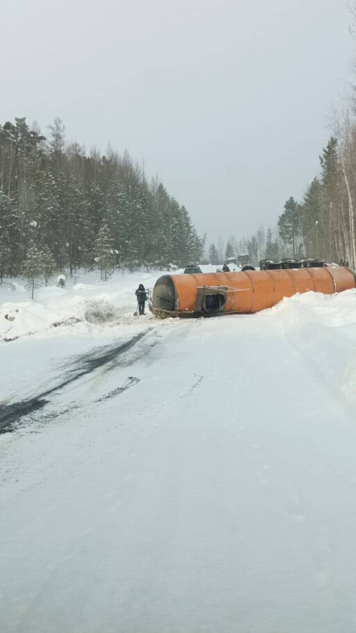 Разлив нефтепродуктов в Якутии. В Ленском районе в 12 км от села Беченча в результате опрокидывания цистерны вытекают нефтепродукты.