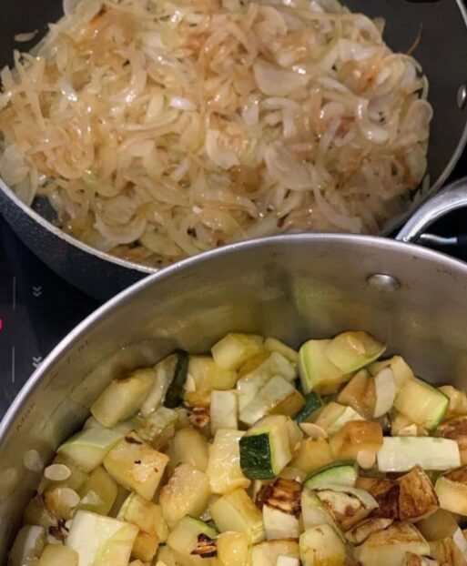 - После кабачков обжарьте лук также небольшими партиями до мягкости и прозрачности. Лук выложите к кабачкам.