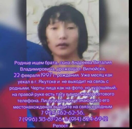 Родные ищут уроженца Вилюйска Виталия Андреева — уехал месяц назад в Якутск и не выходит на связь с родными, сообщает тгк Борбуев. Контакты на фото.