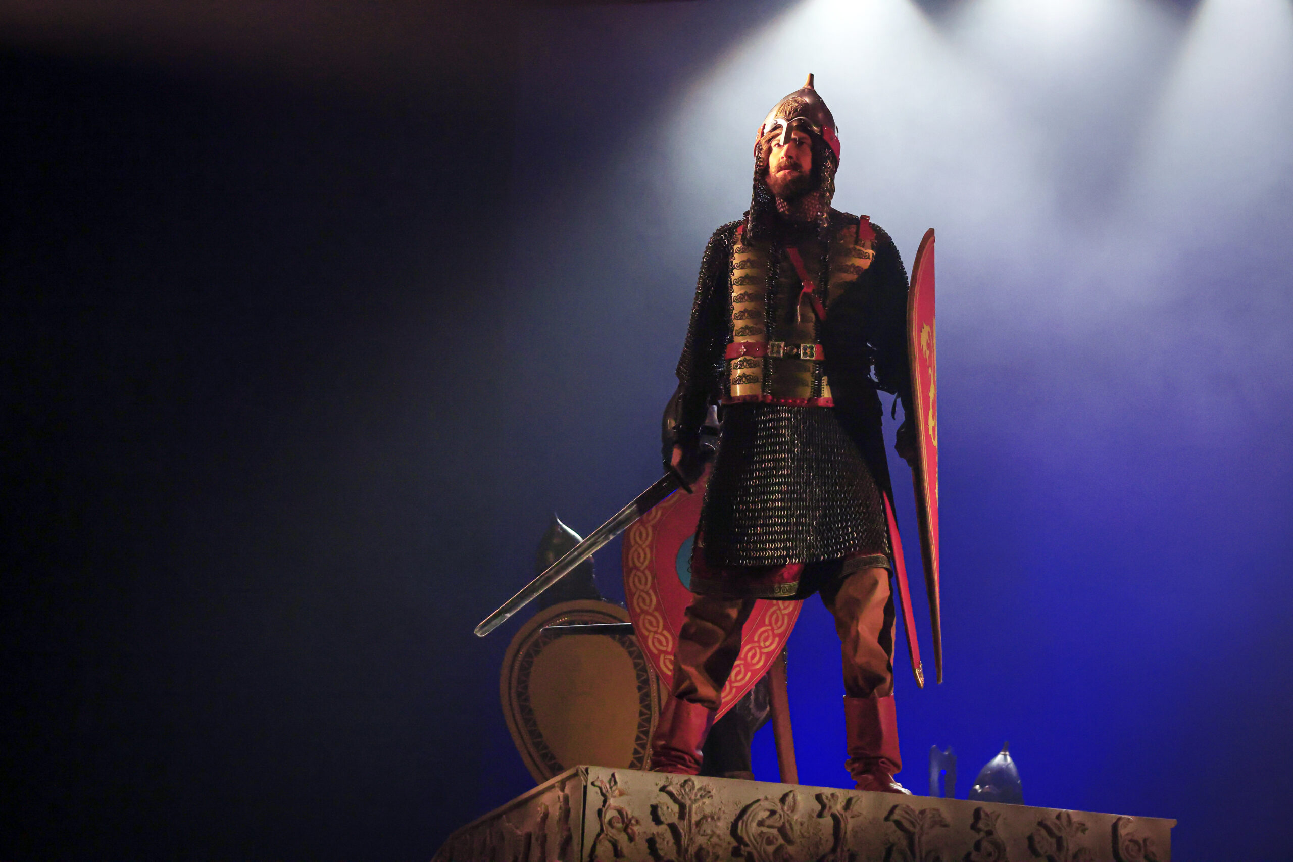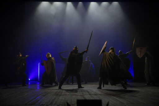 Состоялась в постановке и битва на Чудском озере, показанная, как рассказал летописец. Постановка боевых сцен заняла около месяца, почти ежедневно под руководством постановщика, директора – художественного руководителя театра Александра Лобанова, мужская часть труппы проходила репетиции боев, отрабатывая удары, выпады, защиту. Благодаря федеральному гранту АНО «Русский сезоны» и Минкультуры РФ, театр заметно пополнил фонд сценического оружия. Для воплощения сцены Ледового побоища, битвы монголов было закуплено несколько десятков единиц оружия средневекового образца: длинные мечи каролингского типа – вооружение русских, романские мечи и полутораметровые двуручные мечи с фальшгардой – оружие тевтонцев, изогнутые сабли – оружие монголов.