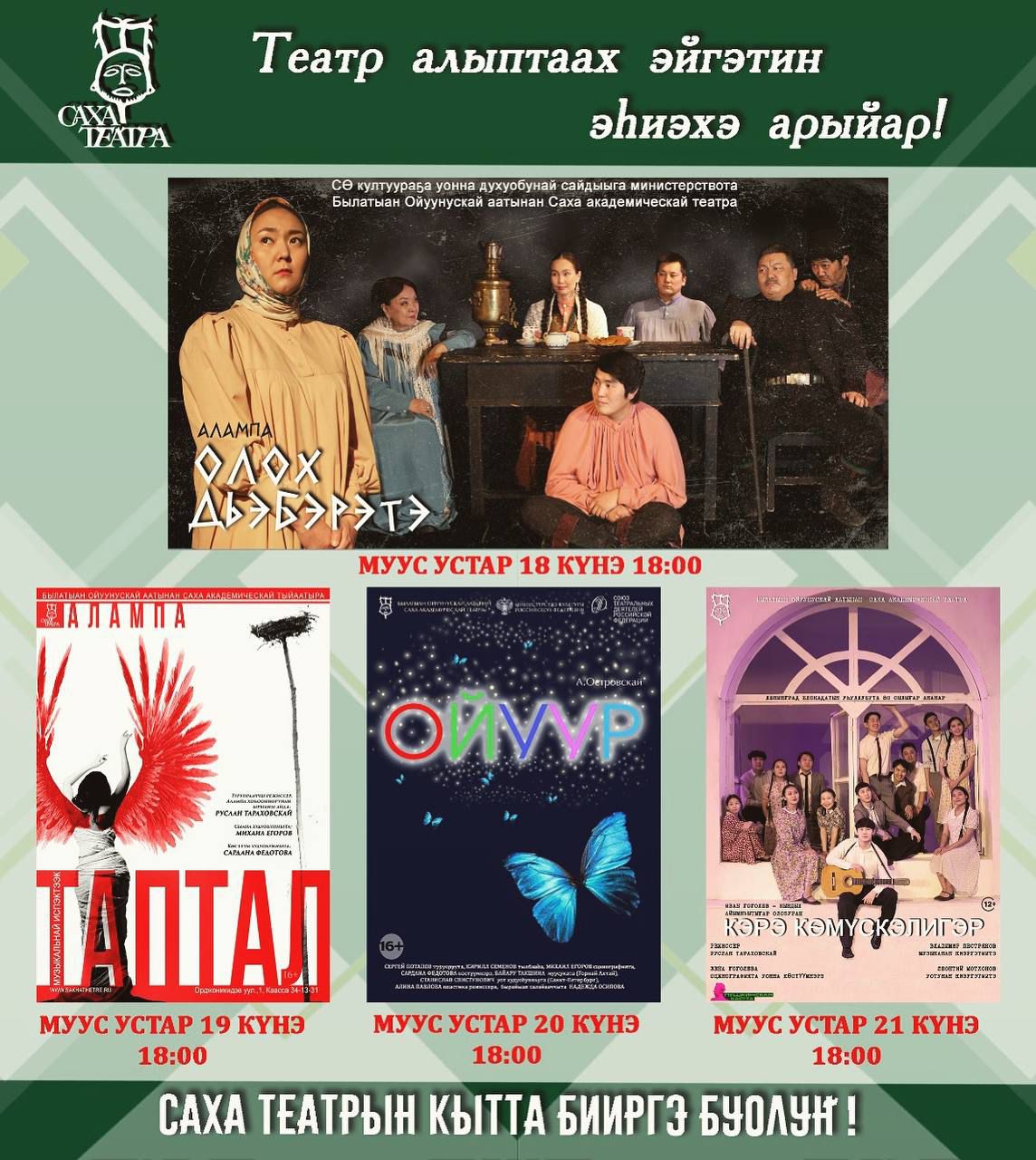 Муус устар 18-19-20-21 күннэригэр Саха театрын умсулҕаннаах уораҕайа испэктээкиллэргэ ыҥырар ✅🏛👏🏼
