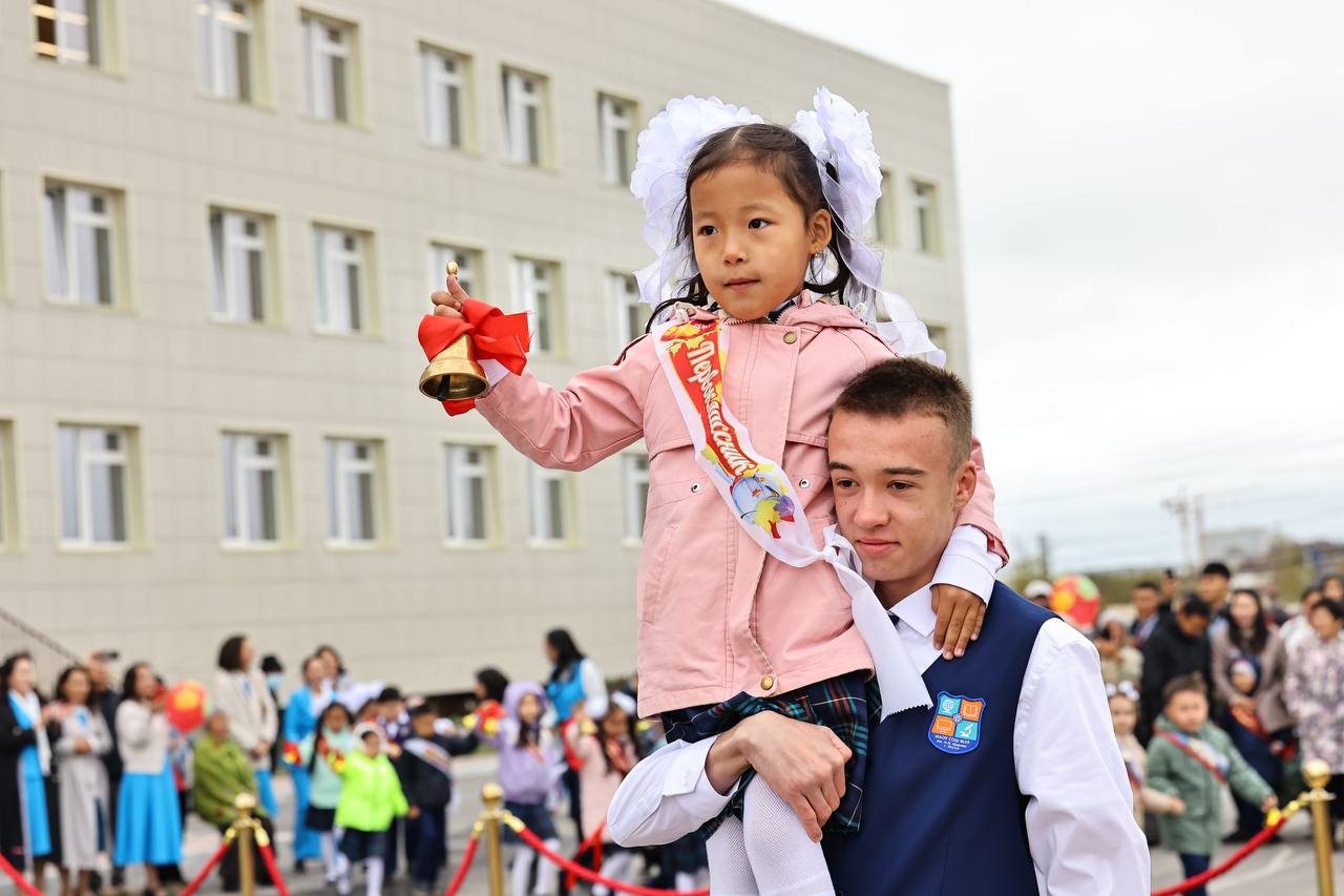 Торжественная линейка началась с исполнения государственного гимна, поднятия флага Российской Федерации и флага Республики Саха (Якутия). Учеников и педагогический коллектив с Днем знаний поздравил глава Якутии Айсен Николаев.