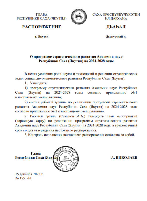 Буквально на днях, 15 декабря 2023 года главой Республики Айсеном Сергеевичем Николаевым подписано Распоряжение об утверждении Программы стратегического развития Академии наук Республики Саха (Якутия) на 2024-2028 годы с разработкой плана мероприятий, ее «дорожной карты».