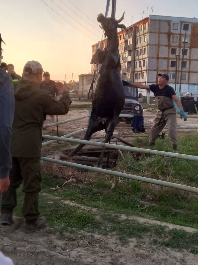 🚒🏗 МЧС үлэһиттэригэр (караул салайааччыта Михаил Тимофеев) чааһынай предприниматель Николай Старостин манипулятордаах массыынатынан кэлэн сүөһүнү хостооһуҥҥа күүс-көмө буолла. Ол түмүгэр сүөһү этэҥҥэ быыһанна.