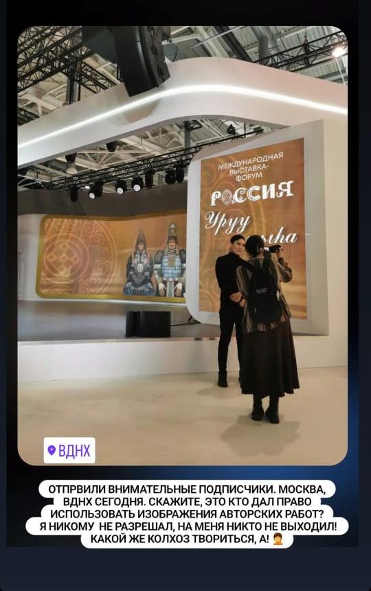 — Внимательные подписчики отправили фотографии из парадного стенда ВДНХ, где сегодня прошли Дни Республики Саха (Якутия). Скажите, это кто дал право использовать изображения авторских работ? Я никому не разрешал, на меня никто не выходил.