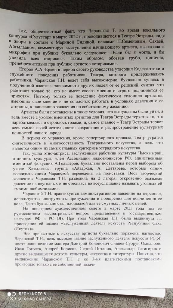 Долго назревавший скандал в Театре эстрады прорвался на поверхность. Звезды Якутской эстрады обратились с письмом к Ил Дархану. SakhaLife публикует это письмо. И в ближайшее время соберет комментарии к заинтересованных сторон. SakhaLife предоставит трибуну всем желающим высказаться. Текст письма предоставлен подписантами.