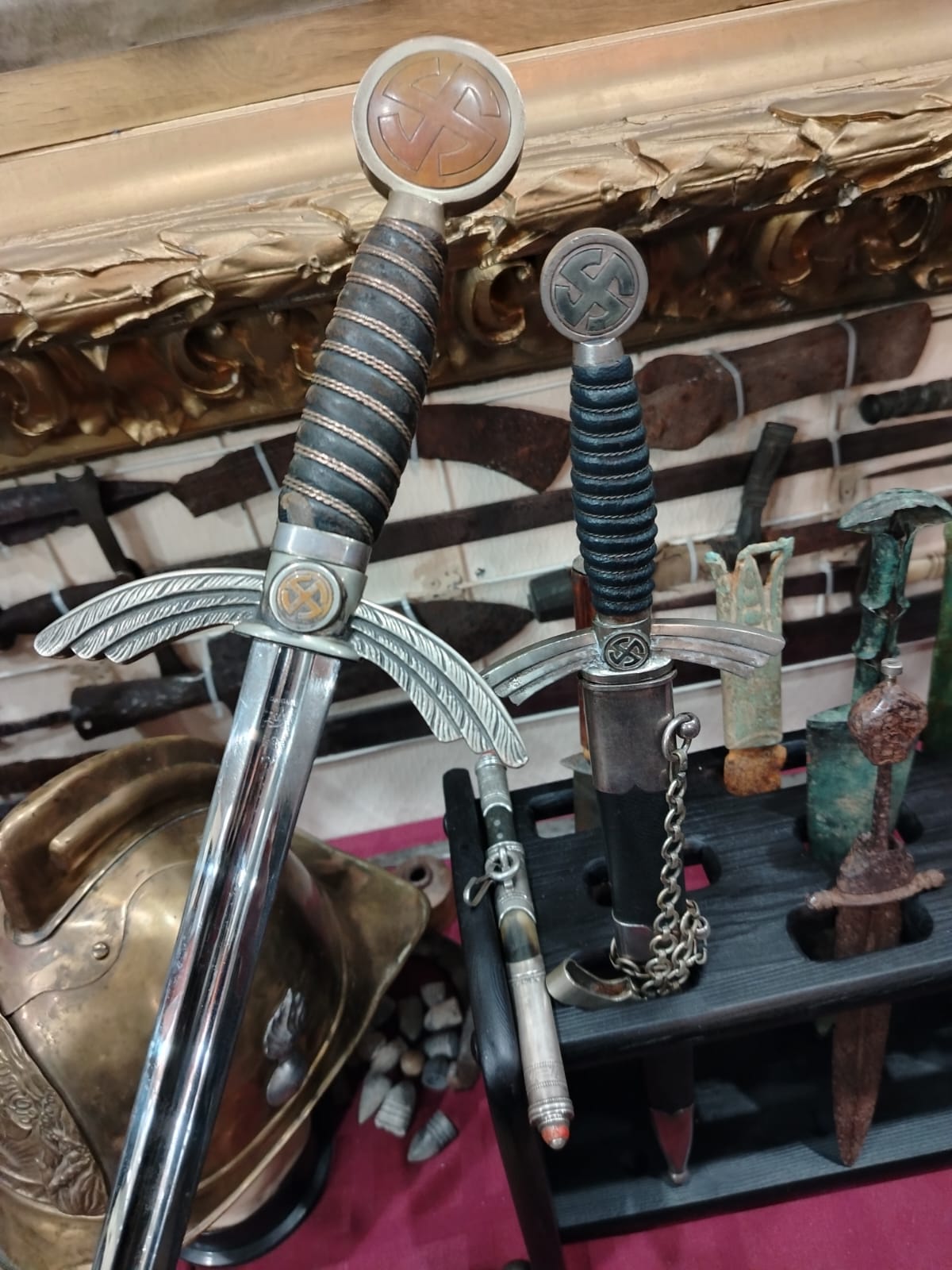 Следующей, огромной по объему группой можно считать подборку старинного оружия. Здесь артефакты разных эпох. Мечи русских витязей и европейских рыцарей возрастом более 1000 лет подружились с 400-летними катанами. Древнеегипетский нож лежит рядом с бронзовым кинжалом из Ирана. Его ковал мастер 3500 лет назад. Кинжал милосердия — тонкий, способный проникнуть сквозь доспехи находится совсем рядом с советскими кортиками. А вот и нож из бивня мамонта, сделанный к 15-летию ЯАССР якутским мастером.