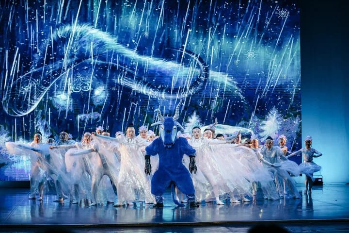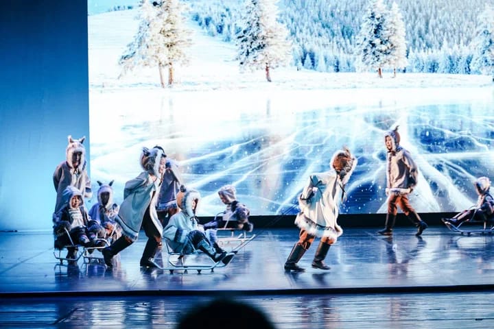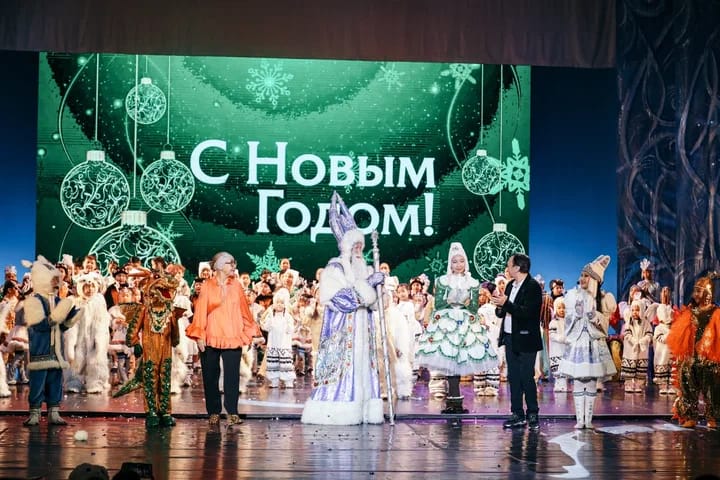 Впечатлила работа художника по костюмам Марьяны Оконешниковой — это хотелось бы отметить отдельной строкой. Она будто нарисовала на сцене и снежинок, и зверушек, и всё это семейство зимних персонажей: хозяйку Холода, внучат, ЭЬЭ КЫЬЫН ТЫМНЫЫ ТОЙОНА, роль которого на себя примерил Карим Громов, Быка Холода, которого исполнил Кирилл Пестерев и даже маленького симпатичного дракончика, ставшего символом Нового 2024 года — всё продумано ею до мелочей.
