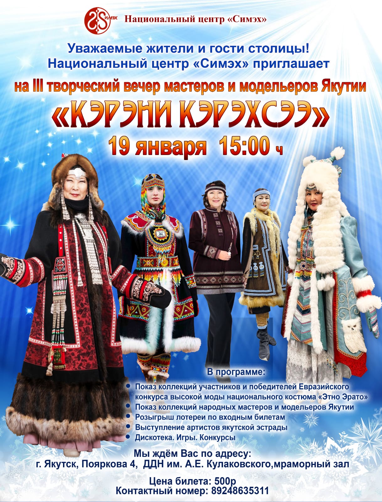 Долгожданный III творческий вечер народных мастеров и модельеров Якутии «Кэрэни кэрэхсээ» обещает быть очень насыщенным и интересным. Ведь в праздничном концерте примут участие ведущие мастера и модельеры Якутии, состоится розыгрыш новогодней лотереи по входным билетам.