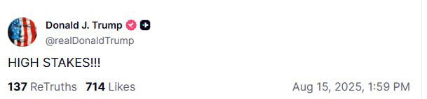 Дональд Трамп опубликовал пост о «высоких ставках» в преддверии своего вылета на Аляску для участия в саммите с российским коллегой Владимиром Путиным — сообщает Российская Газета. Соответствующая публикация размещена в Truth Social.