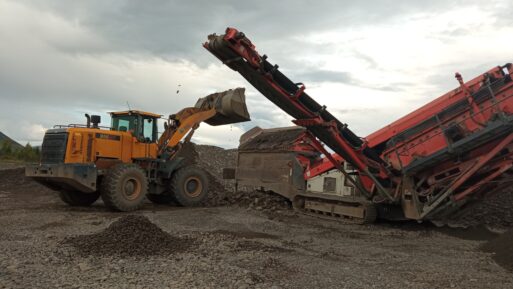 Возле грохота снует погрузчик, закидывающий в его нутро заготовку, камень проходит сквозь него, и из его длинных «рук» в разные стороны ссыпаются в две горы готовая ПГС – в одну сторону, в другую – крупные камни. Крупные используются для укрепления мягкого грунта, мелкая фракция – на «дорожку».