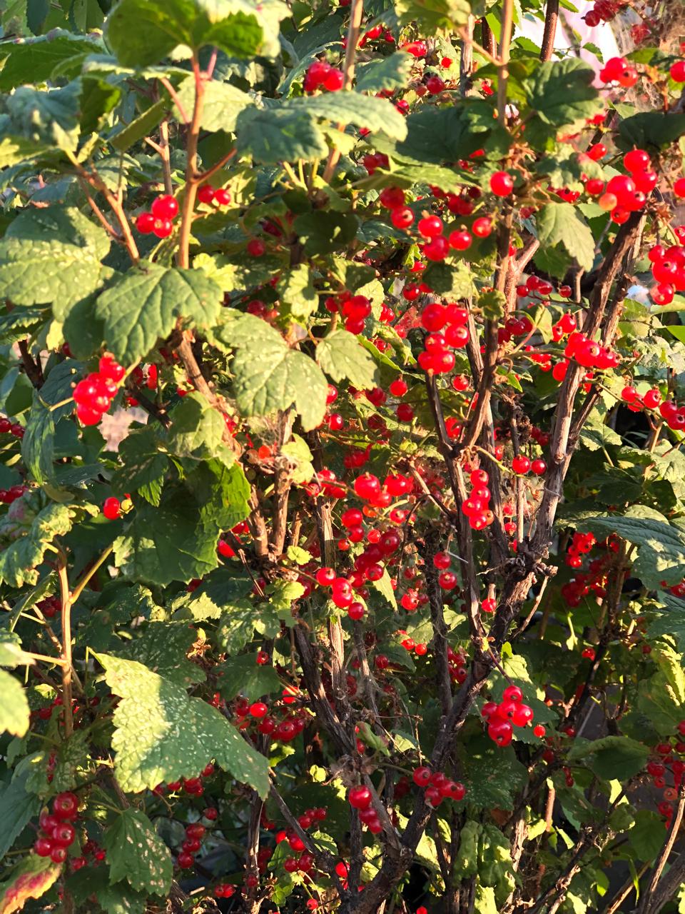 Созрела и красная смородина. Ягоды обильно проросли на кустарнике и аппетитно блестят на солнце.