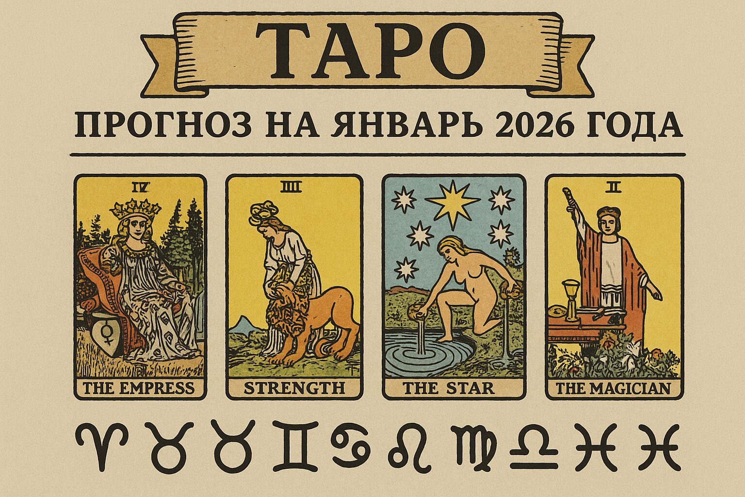 Новый год — это шаг в привычную неизвестность: всё кажется знакомым, но сердце всё равно верит, что впереди будет светлее. Прошлое, конечно, не сдаётся без боя, некоторые вопросы тянутся за нами хвостом, но январь 2026 года, если верить Таро, предлагает не подвиг, а облегчение — тихое, разумное и своевременное. Ниже — прогноз для каждого знака зодиака: по-человечески, с намёком на судьбу и своей картой Таро.