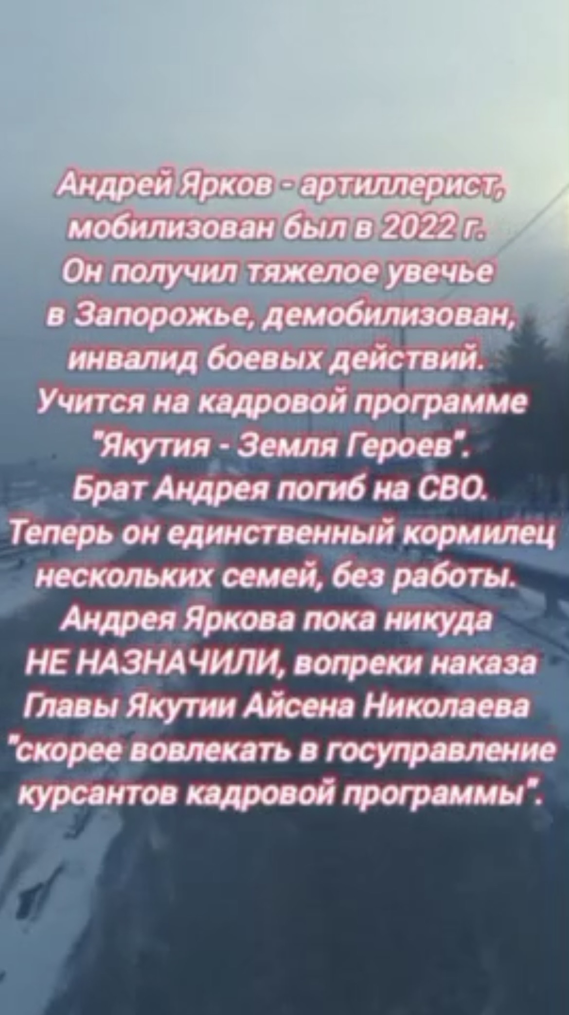 На днях коллеги опубликовали статью о непростой жизни нашего заслуженного земляка — инвалида боевых действий, курсанта региональной кадровой программы, нашего коренного русского якутянина Андрея Яркова.