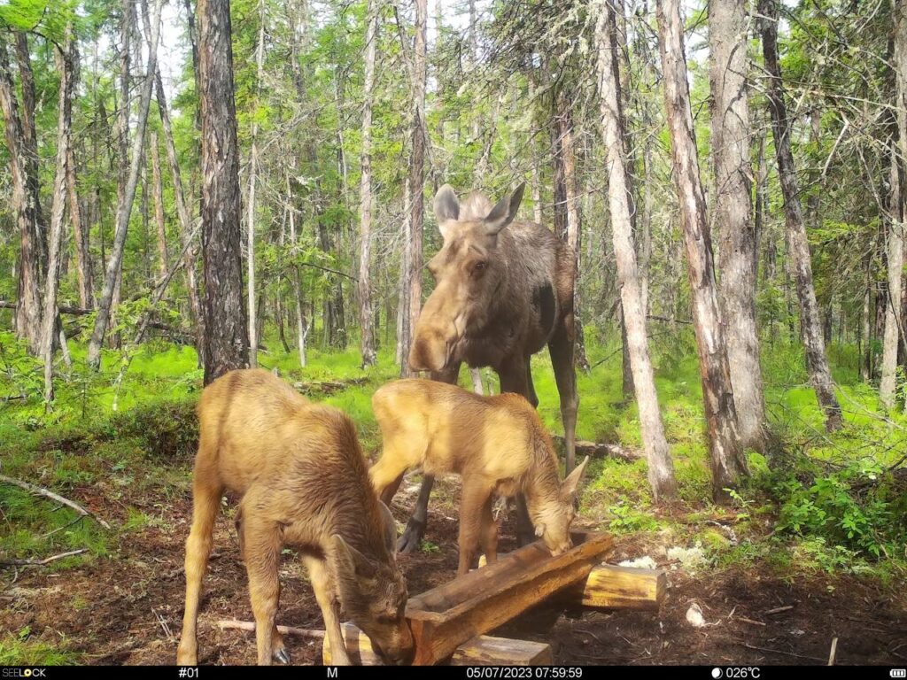 Фотоловушка трижды засняла, как подкармливаются лосиха с двумя лосятами.