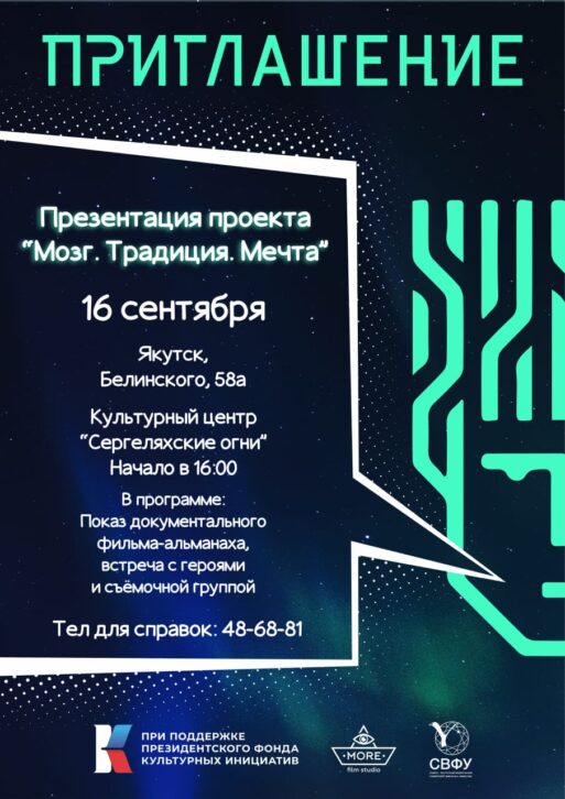 Единственный показ документального фильма Милы Кудряшовой «Мозг. Традиция. Мечта» состоится 16 сентября, во вторник, в 16.00 в культурном центре «Сергеляхские огни». Презентация проекта, поддержанного Президентским фондом культурных инициатив, помимо самого показа включает встречу со съемочной группой, героями и экспертами фильма.