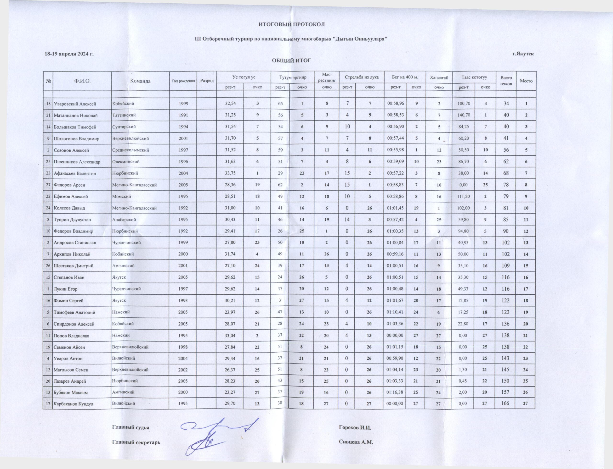 Напомним, что в двух предыдущих состязаниях – на Кубке Чемпиона и чемпионате республики по национальному многоборью – уже были выявлены восемь претендентов, это – Дьулустан Ноговицын (Горный улус), Артем Дьяконов (Кобяйский), Айсен Ботуев (Верхневилюйский), Яков Дмитриев (Кобяйский), Борис Сдвижков (Амгинский), Алексей Соколов (Сунтарский), Николай Обоев (Нюрбинский) и Павел Друзьянов (Чурапчинский).