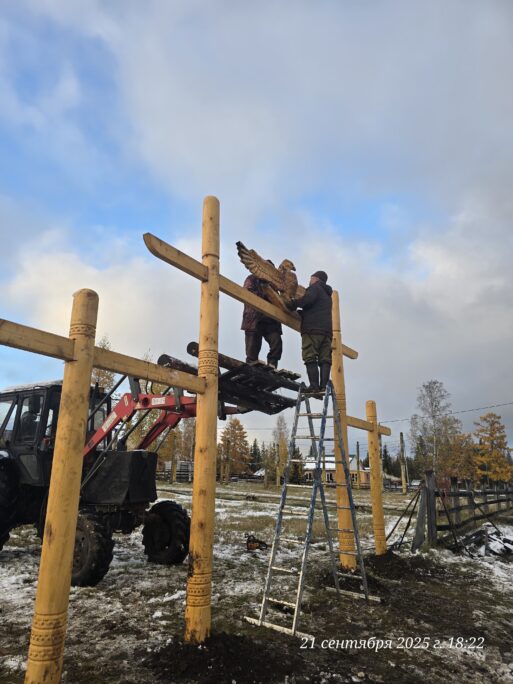 С тех пор прошло 28 лет… Дожди, снега и ветра сделали свое дело. Пришла пора поправить ворота. И эти работы сделали нынче осенью, как уже сказано, народный мастер Александр Игнатьев с Алексеем Степановым. Перед работами Августина Ильинична – алгысчыт высшего 10 клана, провела алгыс. Накануне и с утра шел снег, но на период работ погода наладилась.