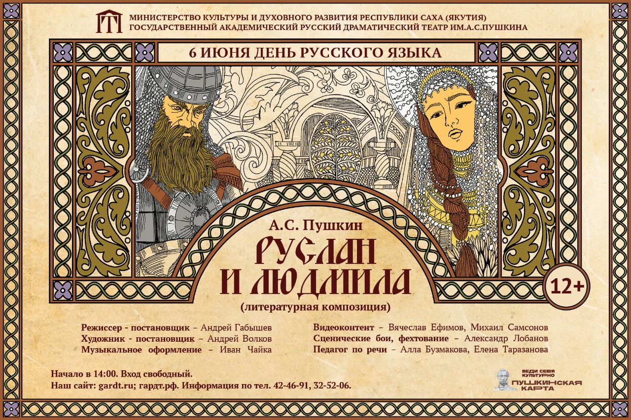 В День русского языка и день рождения Пушкина — 6 июня, в Русском театре им. А.С. Пушкина состоится праздничная программа и премьера литературной постановки «Руслан и Людмила». Начало в 14.00. Вход свободный.
