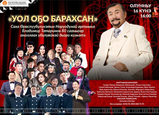 16 февраля любимый и признанный народом артист ВЛАДИМИР ТАТАРИНОВ приглашает зрителей на КОНЦЕРТ, приуроченный к 80-летию со дня его рождения, где в честь Большого мастера выступят самые титулованные и перспективные артисты якутской эстрады. Пусть ещё долгие годы звучит музыка Владимира ТАТАРИНОВА, радуя всех своей мелодичностью, свежестью, душевностью, не лишеная новаторства. ДА БУДЕТ ТАК!!!