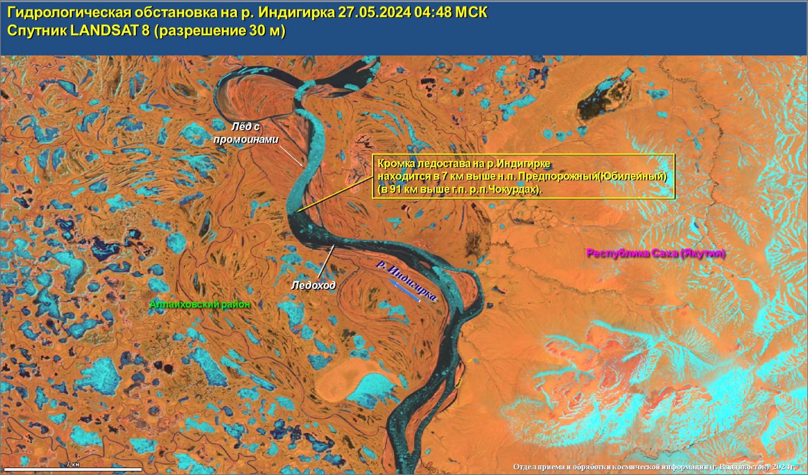 Активная фаза ледохода на реке Индигирка проходит по территории Абыйского района. Нижняя и верхняя кромки расположены с привязкой к н. п. Белая Гора, уровень воды – 808 см при критическом 1202 см. У н.п. Чокурдах Аллайховского района наблюдаются закраины, суточный рост уровней воды составил 1,7 м. Протяженность ледохода – 170 км, за сутки он продвинулся на 40 км. В ближайшие сутки ледоход достигнет Аллайховского района. У н.п. Чокурдах 28-29 мая прогнозируется подвижки льда, 30 мая — 3 июня ожидается вскрытие реки.