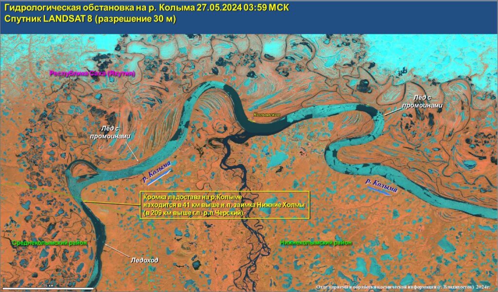 На реке Колыма активная фаза ледохода проходит по территории Нижнеколымского района. Нижняя кромка наблюдается в 23 км ниже с. Колымское, уровень воды составляет 736 см при критическом уровне 1010 см, наблюдается остановка ледохода. Верхняя кромка – в 40 км выше н.п. Колымское. Протяженность ледохода составляет 63 км. Вскрытие реки у п. Черский ожидается 29 — 31 мая.