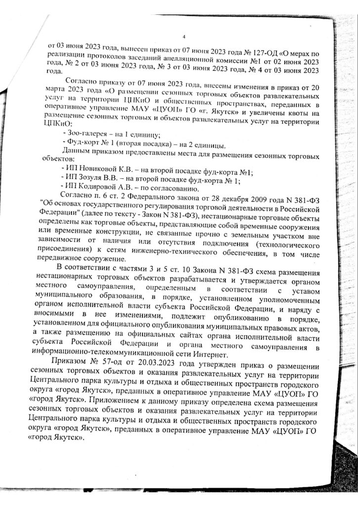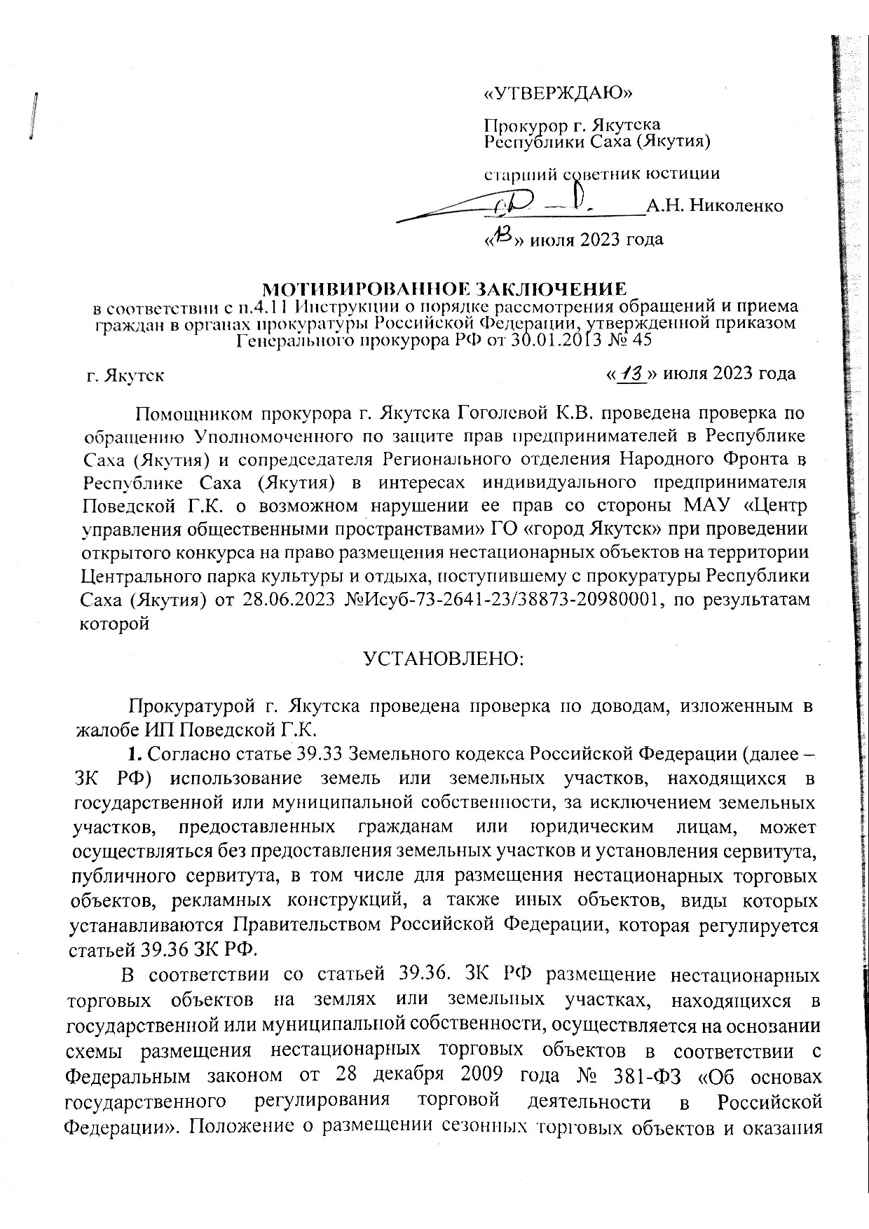 «Заключение договоров может быть осуществлено только по результатам проведения конкурсов или аукционов. Между тем, в положение внесены изменения в том числе о предоставлении места для размещения торговых объектов ИП Новиковой, ИП Зозуля, ИП Кодировой. Полагаю, что в нормативном правовом акте имеется коррупциогенный фактор. Предоставление права заключения договора на основании жалоб индивидуальных предпринимателей носит коррумпированный характер и не может являться основанием для внесения изменений в нормативный правовой акт. Таким образом, нарушены положения закона о защите конкуренции», — говорится в заключении прокуратуры.