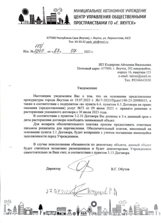 По итогам проверки в адрес директора МАУ ЦУОП внесено представление об устранении нарушений законодательства, после чего он расторг договор с Кодировой А.В. и велел ей освободить занимаемый объект. Однако, по нашим данным, предприниматель до сих пор этого не сделала.