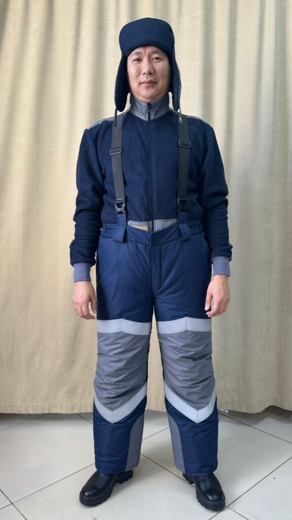 Мужская спецодежда из мембранной ткани с применением утеплителя слайтекс микро для пониженных температур со съемным капюшоном на молнии с дополнительной защитой локтевого сгиба. В комплект одежды входит полукомбинезон мужской с отстегивающей деталью по спинке с дополнительной защитой в области колена, толстовка флисовая на молнии с кокетками из мембранной ткани с дополнительной защитой плеча, шанка мужская, рукавицы с прорезью.