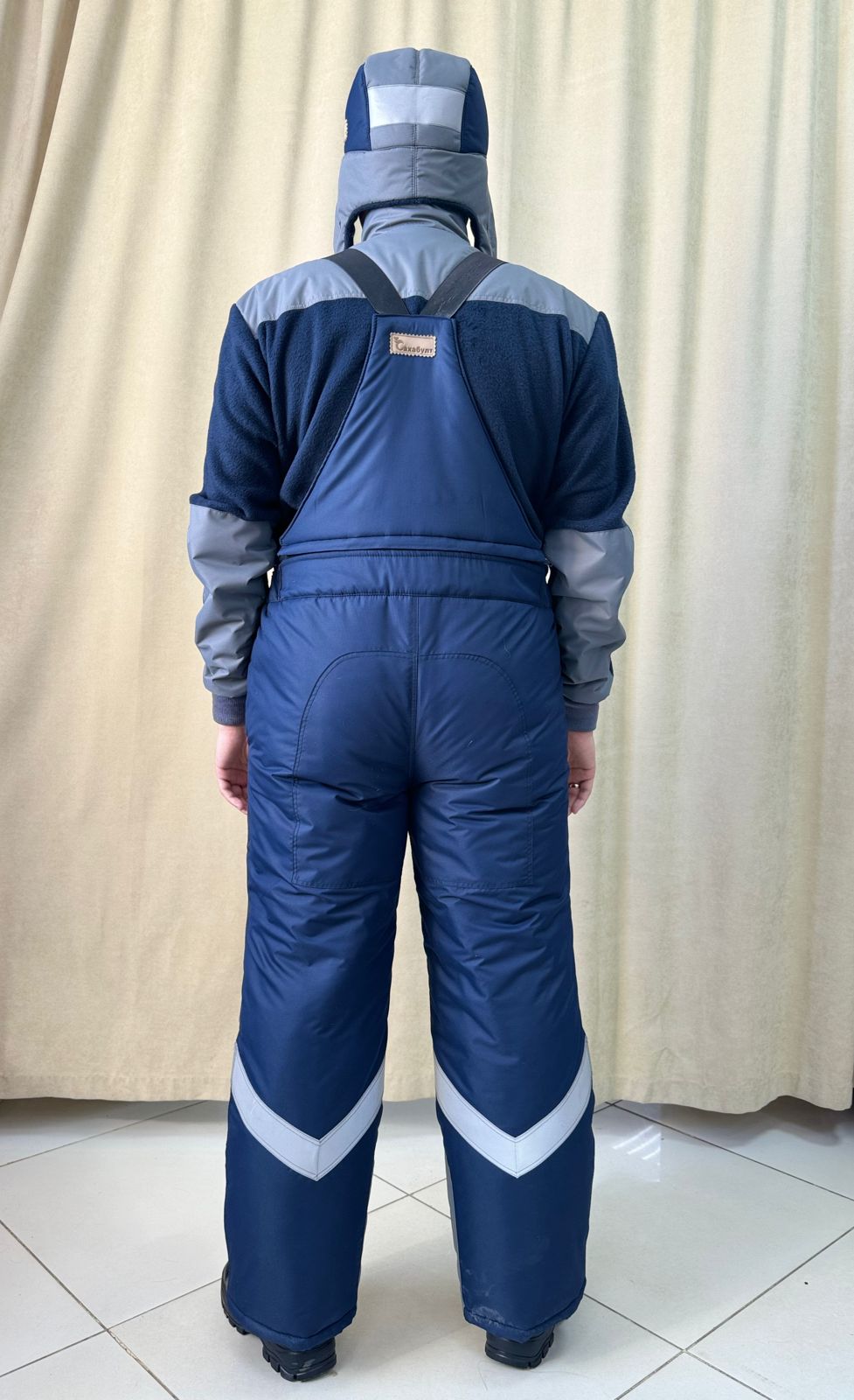 Мужская спецодежда из мембранной ткани с применением утеплителя слайтекс микро для пониженных температур со съемным капюшоном на молнии с дополнительной защитой локтевого сгиба. В комплект одежды входит полукомбинезон мужской с отстегивающей деталью по спинке с дополнительной защитой в области колена, толстовка флисовая на молнии с кокетками из мембранной ткани с дополнительной защитой плеча, шанка мужская, рукавицы с прорезью.