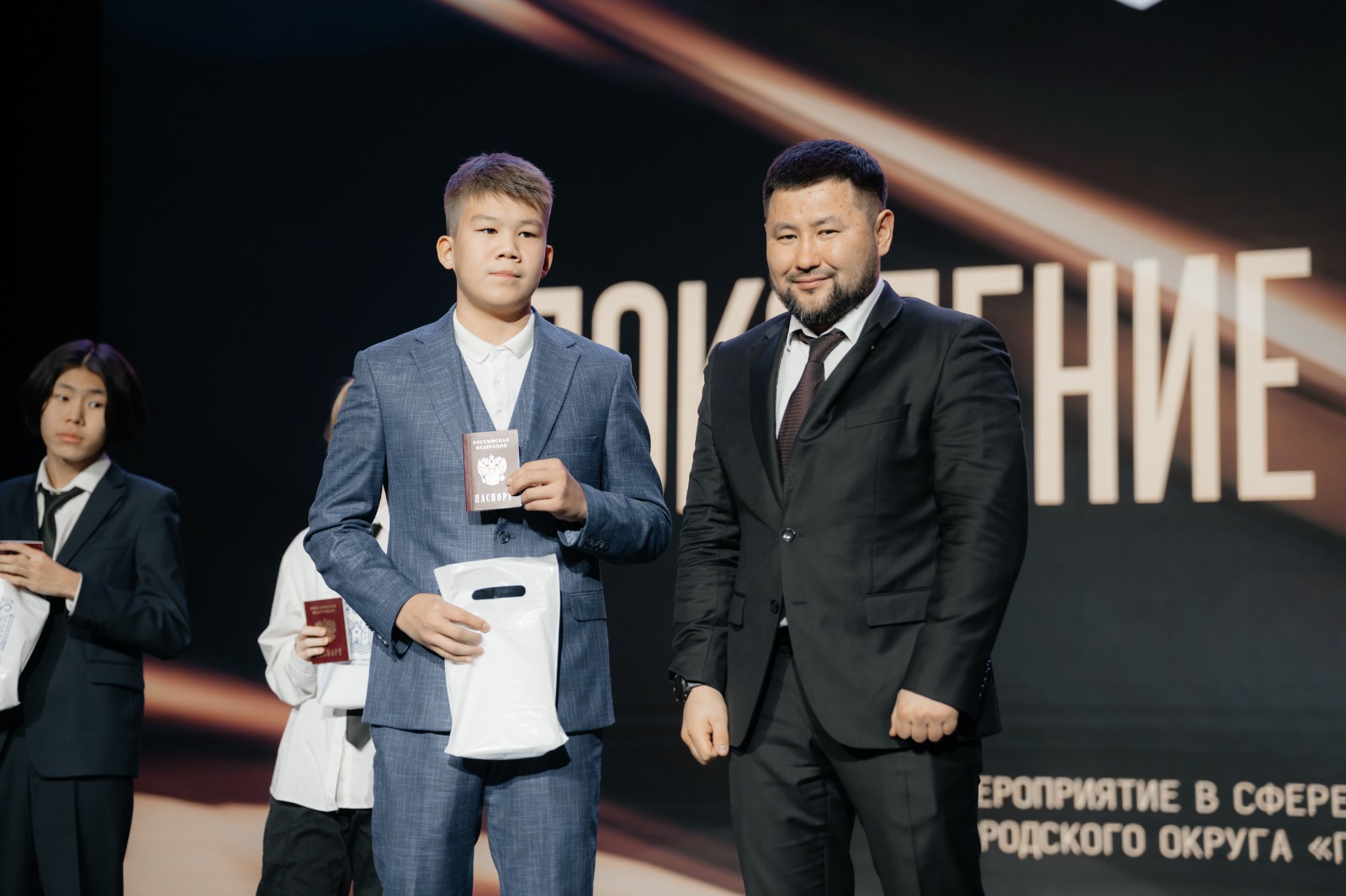 В честь Дня Конституции Российской Федерации глава города Якутска Евгений Григорьев торжественно вручил паспорта гражданина Российской Федерации отличившимся в учебе школьникам, активистам школ и призерам различных конкурсов: ученику 8 класса СОШ №1 Артему Максимову, ученице 8 класса городской классической гимназии №8 Карине Аталларовой, ученице 8 класса СОШ №31 Елизавете Сазоновой, ученику 8 класса национальной гимназии «Айыы Кыhата» Антону Сидорову, ученику 10 класса Технического лицея им. Н.А. Алексеевой Алексею Хвану, ученице 8 класса Физико-технического лицея им. Ларионова Екатерине Романовой.