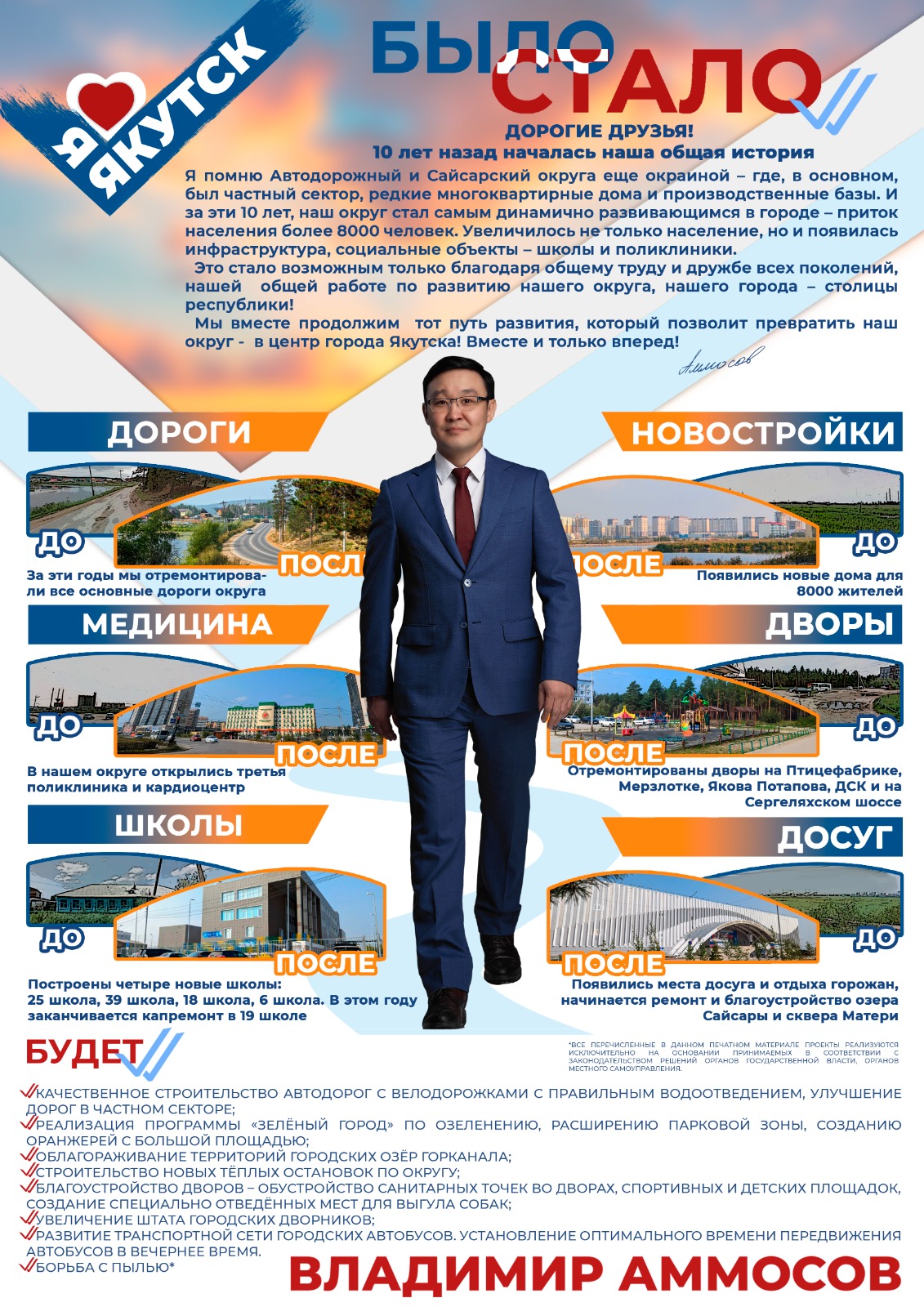 Оплачено из средств избирательного фонда кандидата в депутаты Якутской городской Думы по Автодорожному избирательному округу №2 Аммосова Владимира Владимировича.